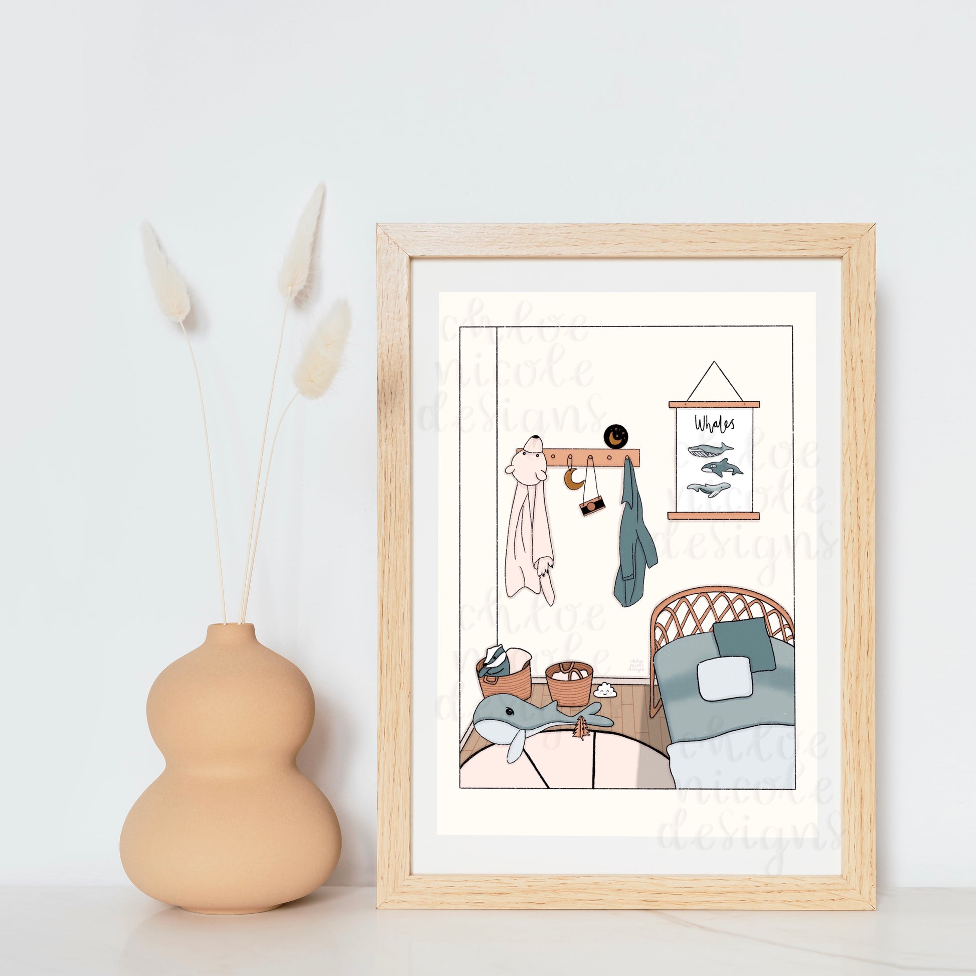 Print of a boys bedroom/nursery. Hand drawn by me.