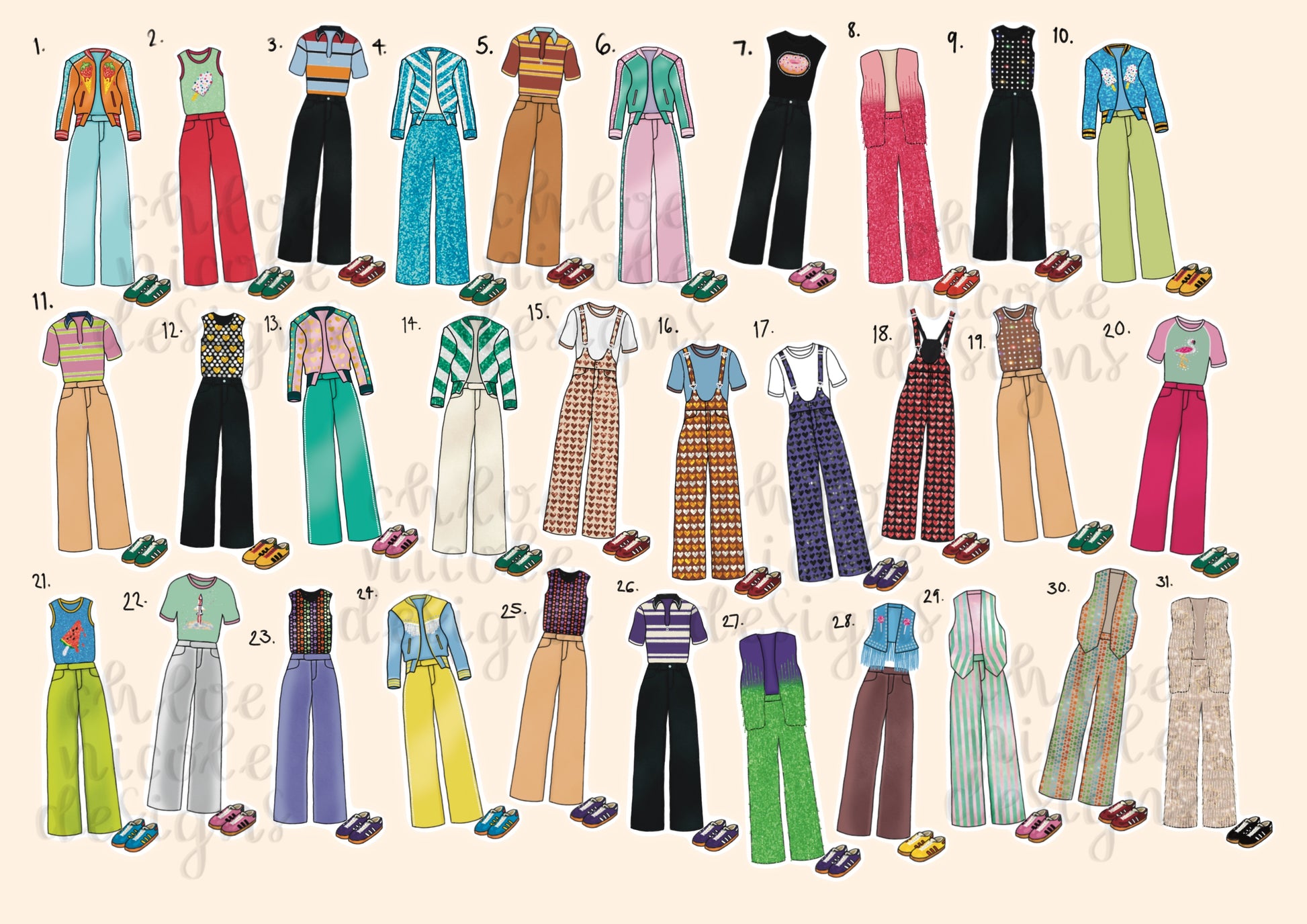 Sticker illustrations of Harry’s outfits for all 31 shows of his Europe 2023 ‘Love On Tour’ tour. If you'd like a set of 5 please specify which ones, or I can just choose random ones. Original artwork, all hand drawn by me.