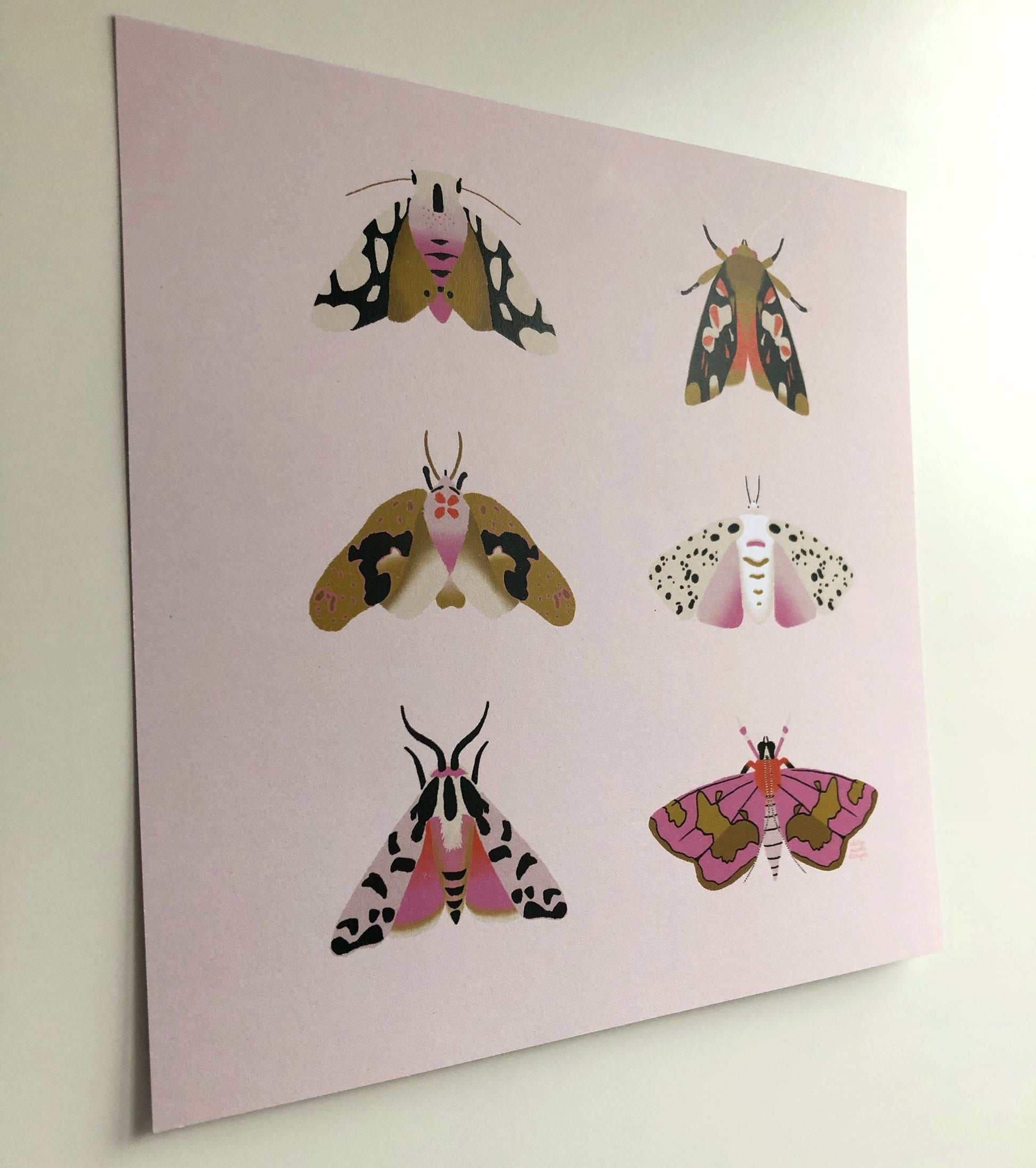 Moth print with 6 moths in the same colour scheme with a pale pink background. Digitally hand drawn design by me.